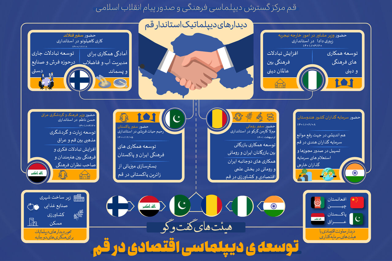 حضور چندین مقام از کشورهای مختلف در استان قم و دیدار با استاندار استان و گفت و گو در خصوص توسعه مسائل فرهنگی، دینی و اقتصادی نشان می دهد قم درحوزه گسترش دیپلماسی فرهنگی و صدور پیام انقلاب اسلامی و همچنین دیپلماسی اقتصادی، فعال تر از گذشته در این مسیر حرکت می کند.