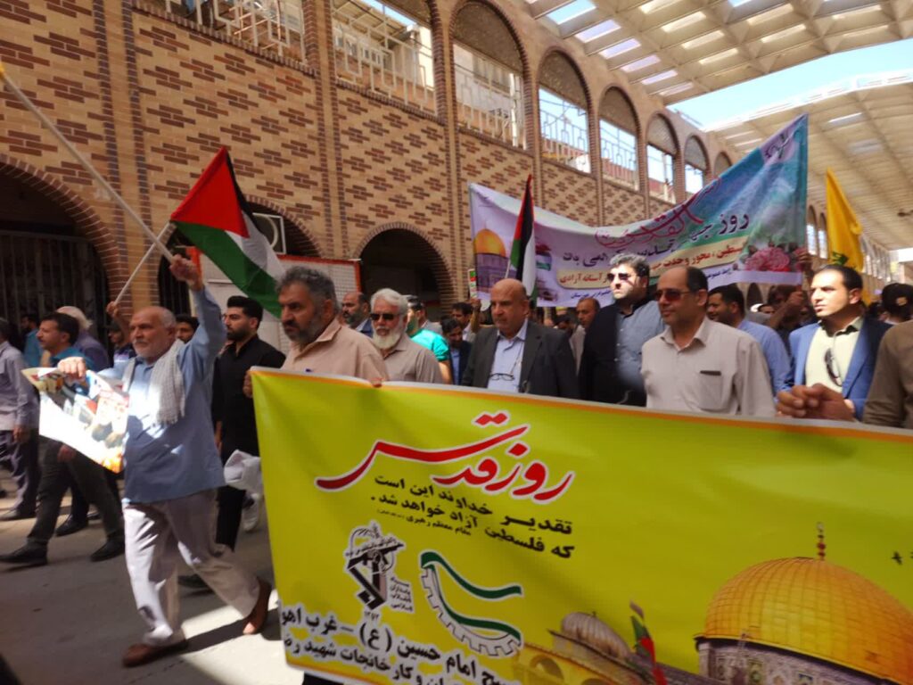 گام‌ها آرام، اما استوار برداشته می‌شد و نجوای یک‌صدای «اتحدوا اتحدوا»، زیر پرچم سه رنگ ایران و بیرق‌های زرد حزب‌الله، تماشایی بود. در آخرین جمعه ماه مبارک رمضان، همه آمده بودند؛ پدری دست در دست فرزند چند ساله‌اش به سمت وعده‌گاه حرکت می‌کرد. مادرانی با کودکانی در آغوش، هم‌قدم با خانواده، به سیل جمعیت پیوستند و در هوای بهاری اهواز، در میانه جنبش پرچم‌ها و مشت‌های گره کرده، نمایی از اتحاد علیه رژیم غاصب را به تصویر کشیدند.