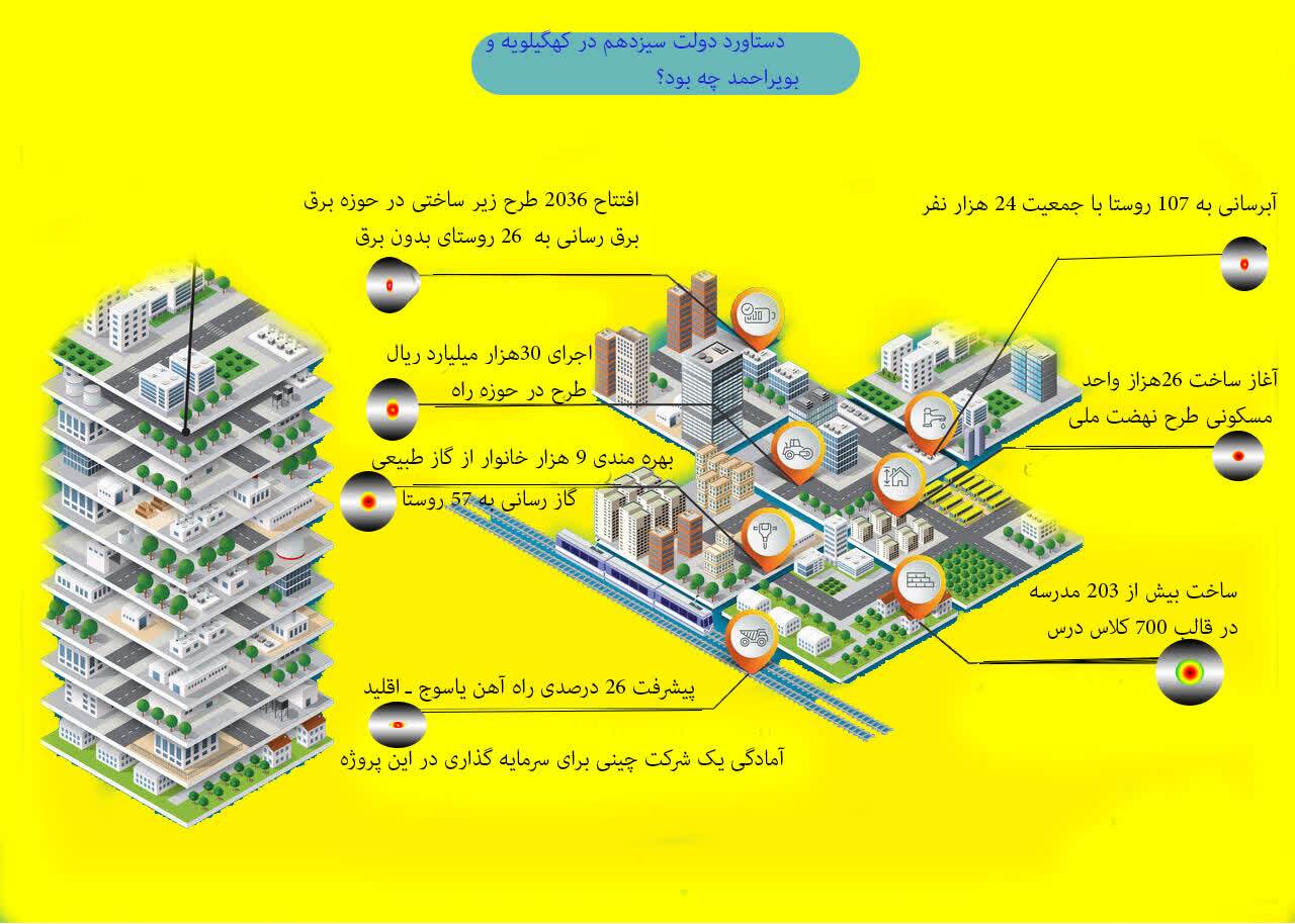 تابناک کهگیلویه و بویراحمد ، تلاش جدی برای گره گشایی از چالش‌ها و مشکلات این استان محروم و کم برخوردار از مهمترین اقدامات دولت سیزدهم در کهگیلویه و بویراحمد بود که در اینفوگرافی بخشی از این اقدامات به تصویر کشیده شده است.